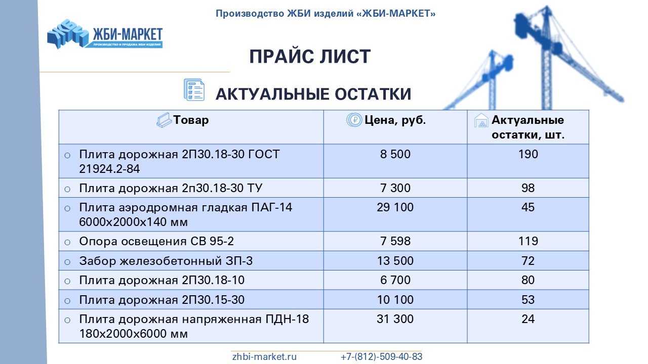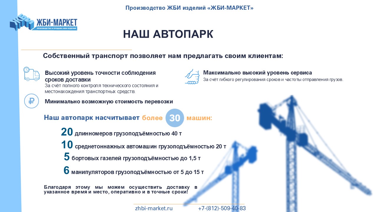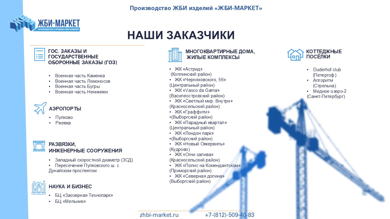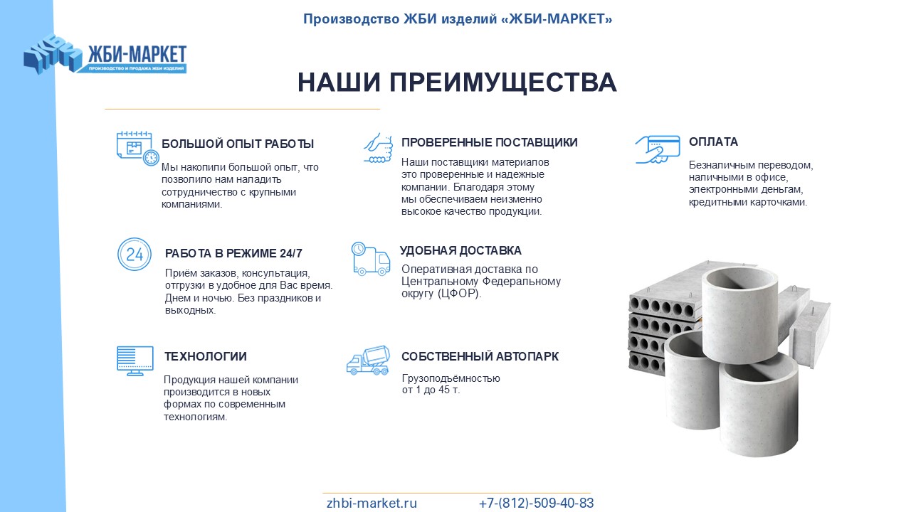 У нас есть 8 крупных складов в Ленинградской области, 3 собственные производственные площадки и 7 заводов-партнеров. Благодаря этому мы можем предложить нашим клиентам широкий выбор качественных железобетонных изделий по низким ценам, которые всегда в наличии на наших складах.