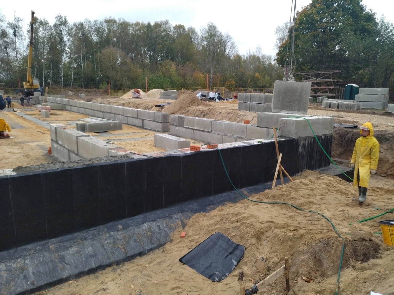 - Обмазочная гидроизоляция: наносится на поверхность конструкций, создавая прочный водоотталкивающий слой. Этот вид гидроизоляции отлично подходит для защиты фундаментных блоков и плит.